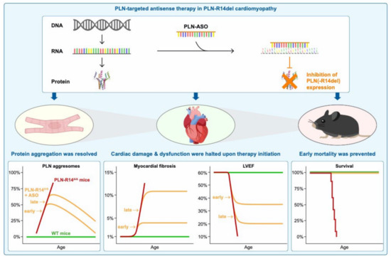 Figure 6. Visual summary of the main findings of this study. PLN-R14 Δ/Δ mice exhibited cardiomyopathy in an accelerated manner with a similar phenotype as human patients, including PLN protein aggregation, severe myocardial fibrosis, and HF. Upon PLN-ASO therapy, Pln mRNA was degraded, resulting in inhibition of PLN protein synthesis. Even when PLN-ASO was administered at an advanced stage of cardio-myopathy, PLN aggregates were cleared, and further progression of cardiac remodeling and dysfunction was halted quickly after treatment initiation. Ultimately, survival of PLN-R14 Δ/Δ mice was prolonged by at least three-fold, indicating that PLN-ASO therapy has great beneficial effects in PLN-R14del cardiomyopathy at severe disease stages.