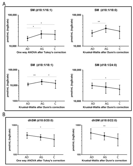 Untargeted MS analysis results for SMs (A) and for dihydrosphingomyelins (dhSMs) (B). Results are expressed as pmol/mL in Log scale (Ad n. 15, Ag n.15, C n.15). p-values are indicated as: * p-value < 0.05 and ** p-value < 0.01.
