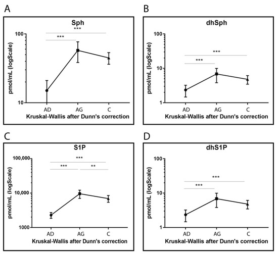 Sph, DhSph, S1P and dhS1P levels increased in Ag and C compared to Ad (p < 0.001) even though lower levels were observed for S1P in C compared to Ag (p-value < 0.001) (Figure 5).