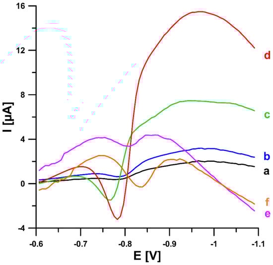Chromatography and spectroscopy are among the popular methods used in the analysis of organic compounds, especially pharmaceuticals. However, these techniques are time-consuming, labour-intensive, and generate a high consumption of reagents. In addition, they require expensive equipment, and due to their complexity, highly qualified analysts are required [,]. In contrast to the above-mentioned methods, electrochemical methods, which include voltammetry, are characterised by a relatively low cost and simplicity of operations, as well as high stability and sensitivity [,]. Electrochemical analysis is practically free of organic solvents, is fast, and can be used on a large scale, thanks to portable, miniaturised tools [,,]. Electrochemical methods, including voltammetry, use electrodes as a conversion element, the surface of which interacts with the analyte and converts the information obtained into a signal that can be measured and identified by means of electrochemical analysis control devices []. The most frequently used method in quantitative analysis is voltammetry coupled with pulse waveform and the accumulation of analyte on the electrode surface, e.g., square-wave adsorptive stripping voltammetry (SWAdSV). Techniques of this kind are considered a tool to obtain the very low limits of detection (LODs) and quantification (LOQs) [].