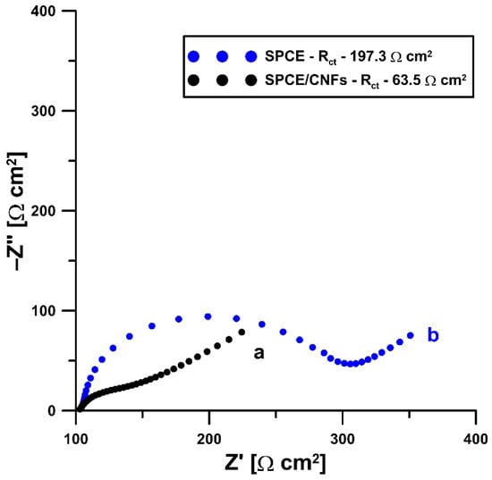 To explain the advisability of modification of the electrode surface by carbon nanofibers, the commercially available, unmodified screen-printed carbon electrode (SPCE) and screen-printed carbon electrode modified with carbon nanofibers (SPCE/CNFs) were examined using the electrochemical impedance spectroscopy (EIS) method. Impedance spectra (Nyquist plots) were recorded in the frequency range from 20.0 kHz to 1.0 Hz at a potential of 0.2 V from a solution of 0.1 M KCl containing 5.0 mM K3[Fe(CN)6]. The obtained curves (Figure 3) clearly show that the presence of carbon nanofibers on the surface of the SPCE (black curve) causes a decrease in the charge-transfer resistance (Rct) compared to the bare SPCE (blue curve) (63.5 vs. 197.3 Ω cm2). Moreover, a better electrochemical performance of the SPCE/CNFs compared to the SPCE is observed as a result of the increase in its active surface due to modification (0.0809 ± 0.0014 vs. 0.061 ± 0.00058 cm2 (n = 3), respectively) [,,].