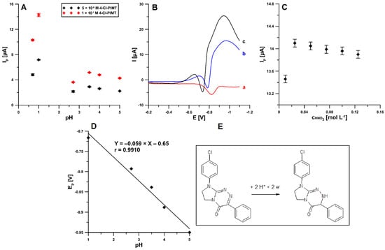 In addition, the linearity of peak potential (Ep) of 4-Cl-PIMT vs. pH plot (Figure 4D) was obtained within the pH range of 1.0–5.0 (r = 0.9910). The equation slope is identical to the theoretical value of 0.059 V pH−1, indicating that the electrode process involves an equal number of protons and electrons. This is demonstrated in the reduction mechanism of our anticancer agent candidate (Figure 4E). It was found that the reduction process of 4-Cl-PIMT occurs at the surface of screen-printed carbon electrode modified with carbon nanofibers (SPCE/CNFs)—as a sensor—through an electron-gain mechanism, with the transfer of two electrons and two protons. The analyte possesses two azomethine moieties of the ketimine-type (C=N). The reduction of each of these azomethine groups (C3=N2, C8a=N1) implies the same number of protons and electrons. On the basis of previous findings [,,,], it was proposed that the C=N moiety located at positions 3 and 2 would be exclusively susceptible to the electrochemical reduction under these experimental conditions, leading to a protonated CH–NH group. This proposal may be supported by the proven susceptibility of this azomethine moiety to electrochemical reduction in structures of monocyclic, as well as fused, triazinones with single N–N bonds [,,]. In addition, this may be supported by the experimentally observed reduction peak potential, the value of which is close to that of the same azomethine moiety of the ketimine-type undergoing regioselective electrochemical reduction in a structurally similar triazinone [].