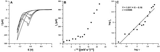 The electrochemical responses of 4-Cl-PIMT (10.0 µM) at the SPCE/CNFs in 0.025 M HNO3 were examined using cyclic voltammetry (CV). The CV curves were recorded for different values of scan rate (ν) from 20 to 450 mV s−1. Figure 5A shows the CV curves for the selected ν of 50, 100, and 200 mV s−1. In the potential range used, one irreversible cathode peak was visible at -0.88 V (ν = 100 mV s−1). The reduction peak potential shifted toward more negative values with the increase in scan rate, which confirmed that the analyte (4-Cl-PIMT) was irreversibly reduced. More information about the electrochemical behaviour of 4-Cl-PIMT at the SPCE/CNFs was obtained based on the measured values of the reduction peak current at various scan rates (20–450 mV s−1). The dependence between the intensity of the peak current (Ip) and the square root of the scan rate (ν1/2) was plotted (Figure 5B), the non-linear course of which indicates that the 4-Cl-PIMT reduction process on the SPCE/CNF surface was adsorption-controlled. Furthermore, the relationship between the log of the peak current (logIp) and the log of the scan rate (logν) was plotted (Figure 5C). The slope of 1.011 in the plot of logIp vs. logν indicates that this process was purely adsorption-controlled [].