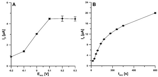 Influence of Eacc (A) and tacc (B) on the peak current intensity of 20.0 nM 4-Cl-PIMT. The mean values of Ip are given with the standard deviation for n = 3.