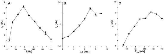 Effect of f (A), ΔE (B), and ESW (C) on the analytical signal of 20 nM 4-Cl-PIMT. Eacc of 0.1 V and tacc of 120 s. The mean values of Ip are given with the standard deviation for n = 3.