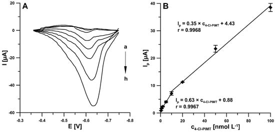Under the optimised experimental conditions presented above, the 4-Cl-PIMT was analysed on the SPCE/CNFs by SWAdSV. The reduction current responses were found to be proportional in the two linear ranges of 0.5–10 nM and 10–100 nM (Figure 8A,B). This is probably connected with the fact that at concentrations higher than 10 nM, saturation took place or the analyte transport mechanism was altered. The limits of detection (LOD) and quantification (LOQ) were calculated at 0.099 and 0.33 nM, respectively, using the following formulas: LOD = 3SDa/b and LOQ = 10SDa/b (SDa, standard deviation of intercept (n = 3); b, slope of calibration curve) [].
