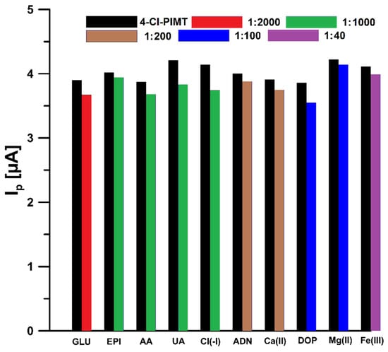 Histogram bars of the 5 nM 4-Cl-PIMT peak current in the presence of interferents. GLU—glucose, EPI—epinephrine, AA—ascorbic acid, UA—uric acid, ADN—adenine, DOP—dopamine.