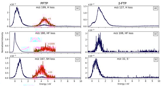 According to our calculations (shown in Table 1), the direct HF formation from PFTP is exothermic by 0.29 eV, and rearrangement of the charge-retaining ring only lowers the threshold to −0.35 eV. For the H and SH losses from PFTP, the calculated thermochemical thresholds were found to be 0.13 and 0.32 eV, respectively. This is in good agreement with our experimental results, where the peak intensities for PFTP are found to be at 0.0 eV for the exothermic HF loss, while the endothermic H and the HS losses are shifted to slightly higher energies. Furthermore, the high relative cross-section for the [M-HF]− formation is consistent with the higher attachment cross-section expected at threshold (~0.0 eV) [].