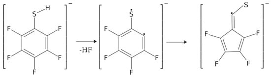 Dissociative electron attachment is not limited to single bond ruptures but may also involve the rupture of multiple bonds and the formation of new bonds. The generation of new chemical bonds provides additional energy to the system and can thus promote DEA and open new reaction channels otherwise inaccessible at low electron energies. In recent years, dissociative electron attachment (DEA) reactions leading to neutral HF formation from perfluorinated benzene derivatives have been the object of several studies [,,,]. The formation of HF feeds 5.9 eV into the system, i.e., the bond energy of HF, and can promote reaction channels that involve the rupture of multiple bonds. Ómarsson et al. [,] conducted detailed experimental and theoretical investigation of HF formation through DEA to pentafluorotoluene (PFT), pentafluoroaniline (PFA), and pentafluorophenol (PFP). There it was shown that the polarization of the X–H bond plays a determining role in neutral HF formation through the promotion of the formation of an intermediate intramolecular hydrogen bond, X–H···F. In these studies, the authors correlated the different magnitude of the polarization of the X–H bond for X = C, N, and O, with the stabilization of the intermediate X–H···F leading to the HF loss in the respective DEA processes. With respect to the thermochemistry, the HF formation upon DEA to PFP was found to be exothermic, partly attributed the subsequent rearrangement of the charge retaining fragment, while in the case of PFA and PFT, the HF formation was found to be endothermic. In fact, it was also pointed out by Rackwitz et al. [] that the neutral HF formation may provide the thermochemical prerequisite for the fragmentation effectuated in DEA to 2-fluoro adenine and that such neutral halogen acid formation is frequently observed in DEA to halo-nucleobases.