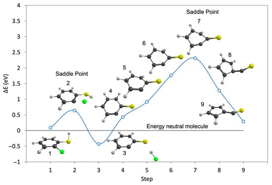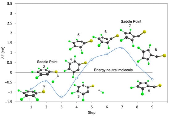 From step 4, the minimum energy path was further calculated considering rearrangement of the ring to form C5F4–CS− and C5H4–CS− from PFTP and 2-FTP, respectively. The same procedure was applied in Ómarsson et al. []. In both PFTP and 2-FTP, the ring rearrangement to the pentagonal structure (from steps 4 to 9) proceeds through a deformation of the ring with a high energy barrier. For PFTP, this reaction is slightly more exothermic than the direct HF loss; however, as can be seen in Figure 3, there is a 1.24 eV reaction barrier on this path for PFTP (from step 4 to 9). This shows that the HF formation from PFTP at 0 eV threshold energy is direct and proceeds without rearrangement of the aromatic ring. Similarly, we find a reaction barrier of approximately 2.3 eV on this reaction path for 2-FTP, showing that the low energy contribution in the [M-HF]− ion yield from 2-FTP must also be attributed to direct HF loss.