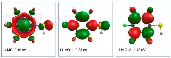 Contour plots of the LUMO, LUMO + 1, and LUMO + 2 of PFTP (B3LYP orbitals). The respective vertical electron attachment energy calculated using the EOM-EA-CCSD method with the B3LYP orbitals and aug-cc-pVTZ basis set are shown for each orbital. The LUMO and LUMO + 1 have a π* character and correlate with a2 (π*) and b1 (π*) MOs, respectively, while LUMO + 2 is a partial diffuse orbital with some electron density on the S and H atoms.