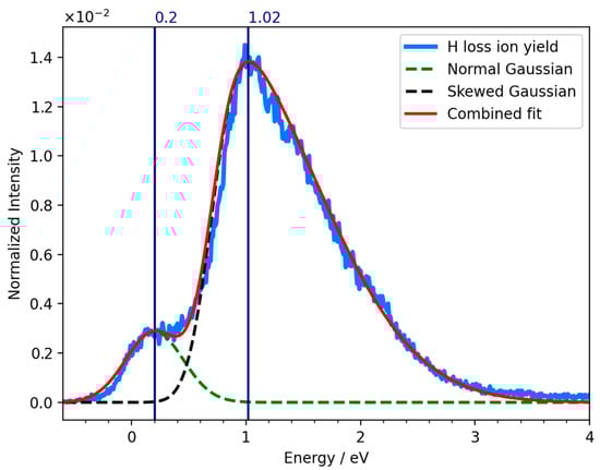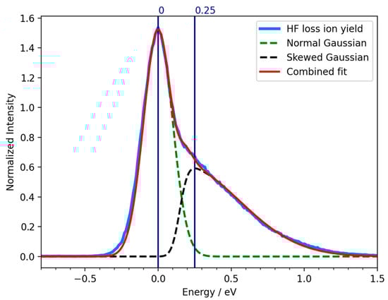 This interpretation is demonstrated in Figure 7, where we present a fitting of the low energy contribution in the negative ion yield curve for neutral HF loss from PFTP upon DEA using a combined fit of normal and skewed gaussian curves. The fitting has been carried out with a python script using the LMFIT library []. For the lower energy contribution, the energy dependence of the autodetachment lifetime is neglected (hence, the normal Gaussian) and the natural width of the underlying resonance is considered to be well below the instrumental energy resolution. The FWHM of this contribution in the ion yield should thus reflects the energy resolution of the instrument, but in praxis it is approximately 250 meV. The skewed gaussian curve is chosen for the higher energy component to take into account the asymmetry of the peaks due to the energy dependence of the attachment process and the autodetachment lifetime []. With this approach, where we consider contributions from both the singly occupied LUMO and LUMO + 1, an excellent fit to the low-energy contribution in the [M-HF]− ion yield from PFTP is obtained.