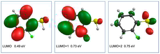 Figure 6 shows the LUMO, LUMO + 1, and LUMO + 2 of PFTP, along with the respective vertical electron attachment energies calculated using the EOM-EA-CCSD method with the B3LYP orbitals and aug-cc-pVTZ basis set. We note that their values are strongly dependent on the basis set while the order is reliable. Adhering to Jordan et al. [], we labelled the π* orbitals according to the C2V point group. The LUMO of PFTP was found to have an σ* character and is anti-bonding along the C–F and C–S coordinates, and there is a polarization along the S–H bond. From a hydrogen bonded S···H···F intermediate, this provides preferential conditions for HF loss from PFTP and the formation of [M-HF]−. This is consistent with the high efficiency of the [M-HF]− formation at approximately 0 eV, assuming that it will proceed from the σ* electronic ground state of the anion. The vertical attachment energy to this state was found to be 0.15 eV. The LUMO + 1 of PFTP has a π* character and correlates with the b1 (π*) MO. The vertical attachment energy to this orbital is approximately 0.73 eV greater than the respective vertical attachment energy to the σ* electronic ground state of the anion. This may be explained by the strong inductive effect through the perfluorination stabilizing the σ* significantly stronger than the π*. Additionally, the mesomeric effect of the S atom is not strong enough to destabilize the b1 (π*) MO and push it above the a2 (π*) MO. This is due to the poor overlap of the 3px orbital of the S atom with the b1 (π) and b1 (π*) orbitals of the benzene ring. We attribute the asymmetry of the low energy peak in the [M-HF]− ion yield from PFTP to dissociation through single electron occupation of π* LUMO + 1. The significantly higher intensity through the σ* ground state may in part be due to the direct dissociation from the σ* state, as compared to the required coupling of the π* with the σ* coordinate, even though such coupling should be promoted by the pJT, causing π*–σ* mixing through the out of plain bending of the fluorine and –SH substituents, as shown in Figure 4. However, the energy dependency of the autodetachment lifetime will also play a significant role. In fact, these effects are intertwined as the DEA cross-section is defined as the product of the electron-attachment cross-section and the survival probability of the TNI [,]. With less coupling and increased energy, the autodetachment process becomes more significant, reducing the survival probability with respect to dissociation, which in turn is reflected in lower DEA cross-sections at higher energies. This affects the shape of the peak in the ion yield curve, which appears asymmetric with a long tail on the right side.