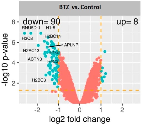 Genetic microarrays were performed in three technical repetitions for both control and BTZ-treated cells. Bioinformatics analysis of the gene expression showed 90 genes with reduced (fold −2 to −6.05; p < 0.05) and 8 genes with increased expression (fold 2 to 2.32; p < 0.05) in BTZ-treated cells compared to control cells (Figure 1).