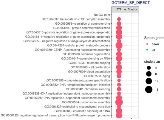 Then, based on the results from the bubble plot, the processes with the largest number of genes were thoroughly analyzed. Details are shown in Figure 3. This figure includes both a global view and a detailed look at specific genes whose expression was reduced by BTZ treatment (p < 0.05). Moreover, these genes have been assigned to the particular processes that they regulate.