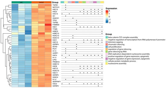 Expression of selected genes presented as a heatmap. Red color means increased gene expression and blue decreased gene expression. In addition, specific genes have been assigned to regulate biological processes (the dot indicates the gene’s participation in a specific process).
