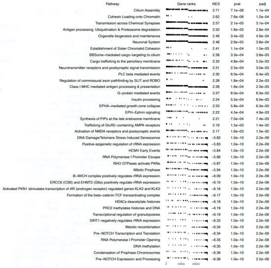 Genes with significantly altered expression have been classified by gene ontology (GO) and assigned to the appropriate biological processes that they regulate (Figure 2). The results of this analysis are presented using a bubble plot with the following criteria: adj. p < 0.05; the Benjamini method used; for each process, there were a minimum of five genes—the size of the bubble corresponds to the number of genes involved in a given process, and the red color represents a reduced gene expression. The most important observed changes, significant for the development of PN, were mainly processes related to epigenetic changes, i.e., GO:0045815~positive regulation of gene expression, epigenetic; GO:0045814~negative regulation of gene expression, epigenetic; GO:0060968~regulation of gene silencing; GO:0031047~gene silencing by RNA; GO:0008283~cell proliferation; GO:0006342~chromatin silencing; GO:0006336~DNA replication−independent nucleosome assembly; GO:0000183~chromatin silencing at rDNA.