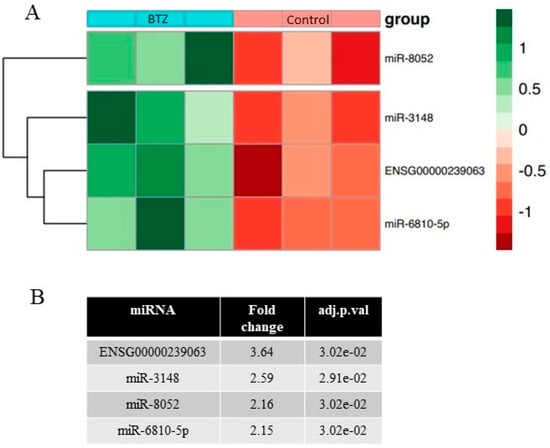 miRNA microarrays were performed in three technical repetitions for both control and BTZ-treated cells. Bioinformatics analysis of the miRNA expression showed 0 miRNAs with reduced and 4 miRNAs with increased expression (fold 2.15 to 3.64; p < 0.05) in BTZ-treated cells compared to control cells. Detailed data on changes in miRNA are presented on the heatmap (Figure 5).