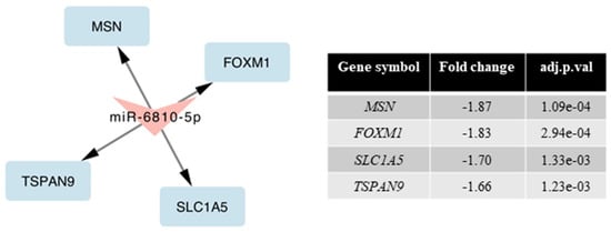 Moreover, we analyzed the mRNA–miRNA interaction. We compared the results obtained with the mRNA arrays to the miRNA arrays. We observed four genes with reduced expression (Figure 6), whose expression is regulated by miRNA-6810-5p. Consequently, an increase in miR-6810-5p expression may inhibit the expression of its target genes. According to the miRDB v. 6.0 database, miR-6810-5p has 481 target genes with a score in the range of 50–98. Seventy-two target genes have target score > 80, which means high confidence targets. The two genes identified by us have a very high target score (FOXM1 = 91; SLC1A5 = 96). The identified genes play a significant role in maintaining the homeostasis of the nervous system (41–45).