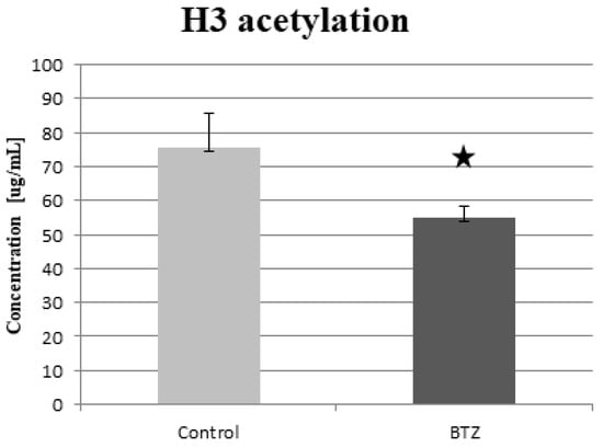 The concentration of global acetylated histone H3 in dLUHMES cells treated with BTZ and in the control cells. * p < 0.05.