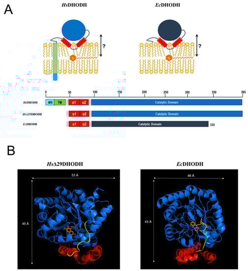 EcDHODH, the structural elements corresponding to the MS and TM are missing, as illustrated in