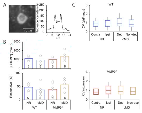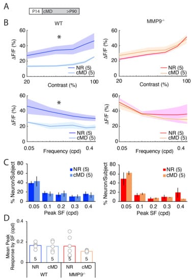 3.1. cMD Regulates Visual Response Strength and Selectivity in WT but Not MMP9−/− Mice