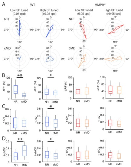 2.3. cMD Impacts the Strength and Selectivity to Visual Stimulus Orientation and Direction in WT but Not MMP9−/− Mice