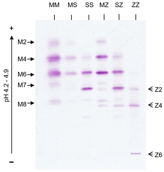 Isoelectric focusing patterns of AAT phenotypes. Healthy control MM AAT glycoforms (M2–M8) are denoted on the left. Glycoforms from an AATD patient homozygous for the Z allele (Z2, Z4 and Z6) are shown on the right.