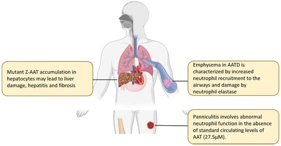 Clinical implications of alpha-1 antitrypsin deficiency. Polymerised aggregates of Z-AAT protein are implicated in the pathogenesis of liver cirrhosis and chronic hepatitis. Accumulation of Z-AAT in hepatocytes leads to impaired secretion of the protein, with individuals homozygous for the Z mutation having 10–15% of normal circulating levels of AAT. Deficiency in AAT results in high influx of neutrophils to the airways, where increased release of serine proteases and uninhibited NE activity can cause damage to lung parenchyma, ultimately leading to emphysema and COPD. In rare cases, AATD is associated with a severe skin condition known as panniculitis and antineutrophil cytoplasmic antibody associated vasculitis (granulomatosis with polyangitis, formally Wegener’s granulomatosis). Panniculitis is characterised by intense neutrophil infiltrates in the subcutaneous tissues and resultant tissue destruction due to the low levels of antiprotease and high levels of protease.