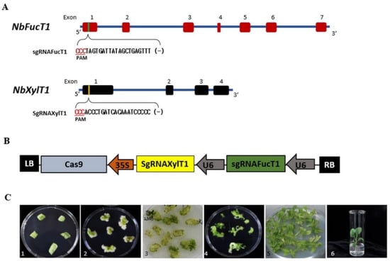- Jansing, J.; Sack, M.; Augustine, S.M.; Fischer, R.; Bortesi, L. CRISPR/Cas9-mediated knockout of six glycosyltransferase genes in Nicotiana benthamiana for the production of recombinant proteins lacking beta-1,2-xylose and core alpha-1,3-fucose. Plant Biotechnol. J. 2019, 17, 350–361. [Google Scholar] [CrossRef] [Green Version]