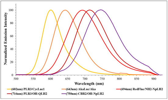 Branchini, B.R.; Fontaine, D.M.; Kohrt, D.; Huta, B.P.; Racela, A.R.; Fort, B.R.; Southworth, T.L.; Roda, A. Systematic Comparison of Beetle Luciferase-Luciferin Pairs as Sources of Near-Infrared Light for In Vitro and In Vivo Applications. Int. J. Mol. Sci. 2022, 23, 2451. https://doi.org/10.3390/ijms23052451