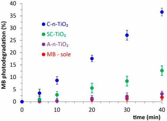 The photocatalytic properties of synthesized samples with different crystallinity are compared in Figure 3. The degree of MB self-photodegradation, i.e., without the addition of any catalysts, was as small as 2% after 40 min irradiation. At the same time, the addition of amorphous material (A-n-TiO2) increased the degradation only up to 3.5%. A significant increase in photocatalytic properties was observed for SC-n-TiO2, as well as for C-n-TiO2 samples. For the latter, MB was degraded 36% after 40 min irradiation.