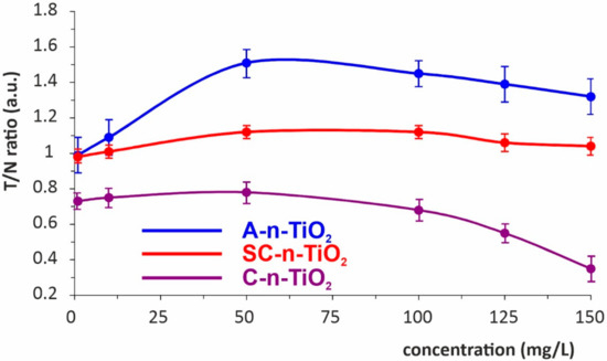 The above results confirm the previously reported and generally accepted low toxicity of crystalline TiO2 in a low concentration range [19]; nevertheless, they proved its toxic effect at higher concentrations specifically after UV-mediated activation.