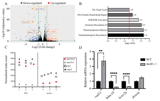 Loss of function of MCT8 affects TH transport and the expression of numerous genes in vertebrates [27,28,29]. To profile the transcriptome of the zebrafish model for MCT8 deficiency, we performed RNA-seq in 6 days post-fertilization (dpf) mct8−/− larvae and their wild-type (WT) siblings. Differentially expressed genes were determined using the DESeq R Bioconductor package, with a criterion of −1 < log2 (fold change) < 1 and adjusted p-value (p-adj) < 0.05. The analysis identified 97 and 204 up-regulated (Table S1) and down-regulated (Table S2) genes, respectively, in mct8−/− larvae (Figure 1A). To identify and classify specific genetic pathways, we utilized the Ingenuity Pathway Analysis (IPA) software and found 23 significantly enriched canonical pathways (p-adj ≤ 0.05). Among these pathways, prominent alterations were found in visual-system-related pathways, such as the visual cycle, retinoate biosynthesis II and phototransduction (Figure 1B). In addition, marked enrichment was found in the VDR/RXR activation pathway, which includes vitamin D receptor-related genes, and is related to hypothyroid diseases [30]. Additional enriched processes include the DNA double-strand break repair and the tetrahydrobiopterin biosynthesis pathways [31]. Taking into account the prominent alteration in the visual system pathways, we profiled the expression of some of the visual genes that are related to these pathways (Figure 1C). The expression of the long-wave-sensitive 1 opsin1 (opn1lw1) and medium-wave-sensitive 2 opsin 1 (opn1mw2) were reduced by 4.35-fold (p-adj = 1.89 × 10−7) and 5.52-fold (p-adj = 3.72 × 10−65), respectively. The expression of the retinol-binding protein 1 (rbp1) and cone photoreceptor cyclic nucleotide-gated channel alpha 3 (cnga3) was reduced by 2.06-fold (p-adj = 9.78 × 10−22) and 2.05-fold (p-adj = 1.6 × 10−24), respectively (Figure 1C).
