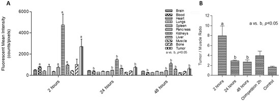 (A) Biodistribution assay: mean fluorescence intensity quantified per organ per group at each timepoint. Different letters (a,b) indicate significant differences (p < 0.05) between fluorescence in the same organ at 2 h versus 24 and 48 h. (B) Tumor/muscle ratio per group. Different letters (a,b) indicate significant differences (p < 0.05) between ratios at 2 h versus 24 and 48 h.