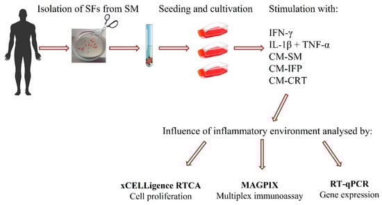 - Belluzzi, E.; Olivotto, E.; Toso, G.; Cigolotti, A.; Pozzuoli, A.; Biz, C.; Trisolino, G.; Ruggieri, P.; Grigolo, B.; Ramonda, R.; et al. Conditioned media from human osteoarthritic synovium induces inflammation in a synoviocyte cell line. Connect. Tissue Res. 2019, 60, 136–145. [Google Scholar] [CrossRef]
