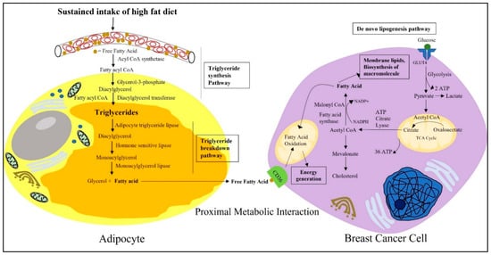 Although the average range of lipid droplets in other cells is 0.1 to 10 μm, in adipocytes they can accumulate up to 100 μm []. Due to the proximity, breast cancer cells use lipids from adipocytes as a source of energy []. Adipocytes can mobilize their stored lipids for breast cancer cell metabolic requirements through neutral lipolysis and autophagy. With the help of the catabolic enzyme adipocyte triglyceride lipase (ATGL), hormone sensitive lipase (HSL), monoacylglycerol lipase (MAGL), triglycerides, or triacylglycerol (TAG) are hydrolyzed into fatty acids (Figure 2) []. ATGL converts triglycerides to diacylglycerol. Then, in the presence of HSL, diacylglycerol converts into monoacyl glycerol []. In the final step, monoacylglycerol breaks down to a free FA and glycerol via the MAGL enzyme-mediated hydrolysis process []. Thus, in obesity, there is an increased availability of circulating free fatty acid for breast cancer cells to offset their continuous metabolic needs. One in vitro study reported that the coculture of breast cancer cells and/or conditioned medium treatment from those cells on mouse 3T3-L1 adipocytes induces lipolysis from their triglyceride stores and increases the release of fatty acids []. Released fatty acids are then taken up by the transmembrane channel protein CD36 found to be overexpressed in metastatic cancer cells []. CD36, also known as fatty acid translocase (FAT), is from a solute carrier protein family that can bind to free fatty acids and facilitate their efficient movement across the plasma membrane []. Further, evidence has also shown that fatty acid-binding protein 4 (FABP-4) is also found to be increased in breast cancer cells and is responsible for the intracellular trafficking of fatty acids [].