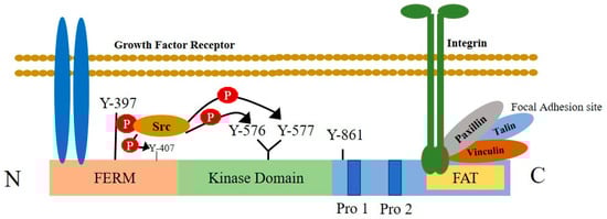 Structural features of focal adhesion kinase and its activation by cell-surface receptors. FAK is composed of a central kinase domain bordered by the N-terminal FERM homology domain and C-terminal region containing two proline-rich motifs and a FAT domain. The interaction of integrins with extracellular ligands, increases large macromolecular clusters on the cell cytoplasmic side that anchors the actin cytoskeleton to the plasma membrane in connection with the integrin-associated proteins talin, paxillin, and vinculin. This is known as the focal adhesion site. FAK connects with the focal adhesion sites of integrin through its C-terminal domain containing a focal adhesion targeting (FAT) sequence. The N-terminal FERM domain integrates signals from growth factor receptors. In response to extracellular stimuli, FAK activation causes the autophosphorylation of FAK at the Tyr397 residue and creates an SH2 domain docking site that interacts with proteins, such as Src. This interaction activates the Src tyrosine kinase, which further trans-phosphorylates other tyrosine residues placed on FAK and maximizes kinase activity.