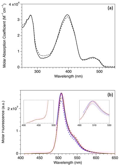 - Heikal, A.A.; Hess, S.T.; Baird, G.S.; Tsien, R.Y.; Webb, W.W. Molecular spectroscopy and dynamics of intrinsically fluorescent proteins: Coral red (dsRed) and yellow (Citrine). Proc. Natl. Acad. Sci. USA 2000, 97, 11996–12001. [Google Scholar] [CrossRef] [PubMed]