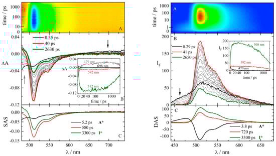 - Kennis, J.T.; Larsen, D.S.; van Stokkum, I.H.; Vengris, M.; van Thor, J.J.; van Grondelle, R. Uncovering the hidden ground state of green fluorescent protein. Proc. Natl. Acad. Sci. USA 2004, 101, 17988–17993. [Google Scholar] [CrossRef] [PubMed]