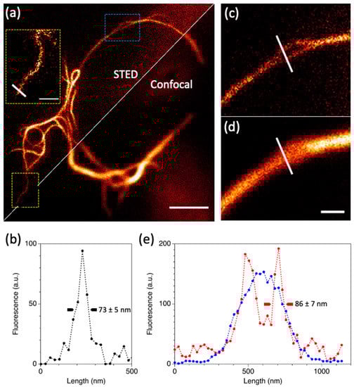 - Hein, B.; Willig, K.I.; Hell, S.W. Stimulated emission depletion (STED) nanoscopy of a fluorescent protein-labeled organelle inside a living cell. Proc. Natl. Acad. Sci. USA 2008, 105, 14271–14276. [Google Scholar] [CrossRef]