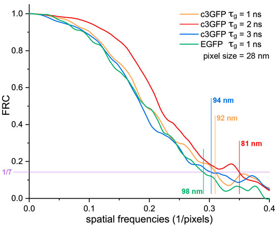 2.4. In Cellulo STED Imaging of c3GFP and Comparison with EGFP