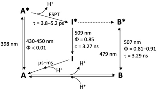 - Chattoraj, M.; King, B.A.; Bublitz, G.U.; Boxer, S.G. Ultra-fast excited state dynamics in green fluorescent protein: Multiple states and proton transfer. Proc. Natl. Acad. Sci. USA 1996, 93, 8362–8367. [Google Scholar] [CrossRef]