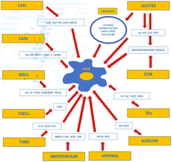 CAFs are a population of fibroblasts or transformed MSCs that play an indispensable role in the TME by affecting the progression, dissemination and chemo-resistance of OCSCs. The functional activation of CAFs depends on inflammatory signals and hypoxia [,,,,,]. OC cells are able to convert omental fibroblasts into CAFs by the secretion of chemokine CCL5 and exosomes containing miRNAs []. Activated CAFs secrete TGF-β, which stimulates epigenetic changes promoting EMT and metastases and in a positive feedback loop stimulating CAFs themselves to stronger tumor-promoting phenotypes []. The strong pro-tumoral activity of CAFs could be also stimulated by dickopf-related protein-3 (DKK3) which enhances YAP/TAZ and Wnt/β-catenin signaling pathways. Increased stromal expression of DKK3 has been correlated with aggressive behavior of OC tumors []. The expression of metalloproteinases and environments rich in ROS also are able to activate CAFs []. In OC, CAFs stimulate cancer invasiveness and chemo-resistance through the secretion of hepatocyte growth factor (HGF), glucose-regulated protein 78 (GRP78), and the activation of hepatocyte growth factor receptor HGFR (also known as cMet)/PI3K/AKT signaling pathway [,]. The activation of insulin growth factor-1 receptor (IGF-1R)/AKT signaling by CAFs in response to chemotherapeutic drugs induces chemoresistance and stemness of OC cells by an increase in NANOG, OCT4 and SOX2 []. Moreover, CAFs stimulate OCSCs via fibroblast growth factor (FGF) to autocrine VEGF-A secretion. VEGF-A through VEGF-R2 receptor activates proto-oncogene tyrosine-protein kinase Src-dependent up-regulation of stem cell factor B-cell specific Moloney murine leukemia virus integration site-1 (Bmi1), thus augmenting the stemness of OCSCs []. The secretion of VEGF by CAFs also affects tumor endothelial cells, thus influencing angiogenesis and chemo-resistance, whereas the secretion of MMPs, ECM components, and enzymes helps to remodel the TME according to the tumor demands [,]. CAFs also change immune balance inside the tumor by the suppression of cytotoxic TILs and the promotion of pro-inflammatory signals [,].