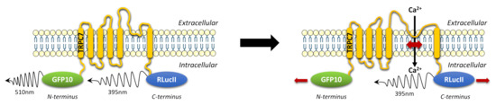 As Liu et al. developed an intramolecular BRET to monitor TRPC3 activity, we used the same design for TRPC7 [18]. However, while their method of detection was BRET1, we used BRET2, changing the YFP for a GFP10, thus increasing the wavelength separation between RLucII and fluorescent protein emission, resulting in an improved detection and discrimination of signals [21].