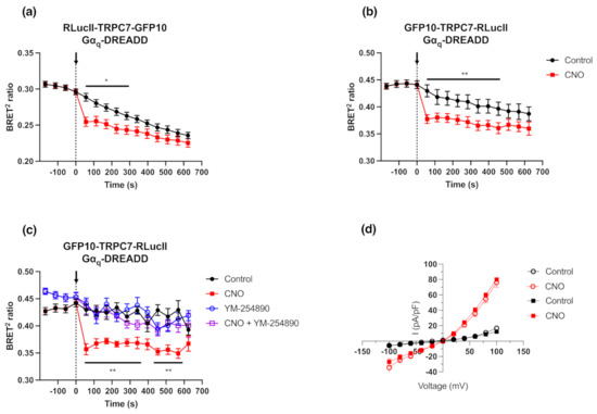 Double brilliance GFP10-TRPC7-RLucII biosensors allow the detection by BRET of TRPC7 conformational changes in response to Gαq-DREADD activation while being fully functional. (a,b) HEK293 cells were co-transfected with plasmids encoding RLucII-TRPC7-GFP10 or GFP10-TRPC7-RLucII biosensors (75 ng) and Gαq-DREADD (500 ng), and were stimulated with Clozapine-N-Oxide (CNO; 1 µM) or vehicle as a control. The BRET signal was measured for 10 min. (c) HEK293 cells were transfected in the same conditions as in (a) and were pre-incubated with YM-254890 (Gαq inhibitor; 1 µM) or vehicle for 10 min before basal BRET signal was read. The BRET signal was measured for 10 min following stimulation with CNO (1 µM). Each data set represents the mean of three independent experiments, which were each performed in triplicate, and expressed as the mean ± S.E.M. (d) Whole-cell patch-clamp experiments on HEK293 cells were performed 48 h after co-transfection with plasmids encoding Gαq-coupled DREADD and TRPC7 WT (open circles) or the GFP10-TRPC7-RLucII biosensor (closed squares). Current–voltage relationships were obtained from the TRPC7 WT and GFP10-TRPC7-RLucII in control conditions (black symbols) and following Gαq-coupled DREADD stimulation with CNO (red symbols; 1 µM). Each data set represents the mean of seven (7) recordings ± S.E.M. Statistical analyses were performed using a two-way ANOVA with multiple comparisons followed by a Sidak’s post-hoc test. * p < 0.05, ** p < 0.01 for control vs. CNO.