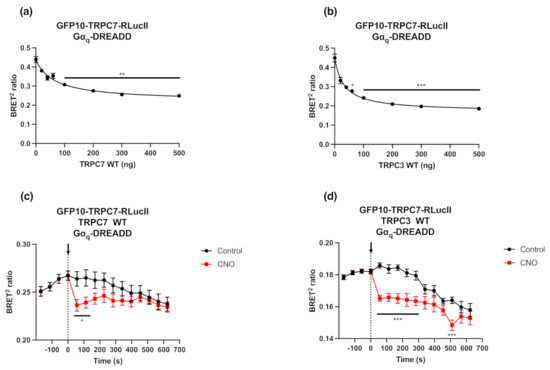 Fully functional cationic TRPC channels are formed either as homotetramers or heterotetramers [26,27,28]. Thus, we overexpressed the untagged TRPC7 WT or one of its partners, TRPC3 WT, to verify whether the observed BRET signal changes were solely due to intramolecular changes in conformation of GFP10-TRPC7-RLucII or to the relative intermolecular changes upon pore opening in a homo- or hetero-tetrameric protein complex. The competition between GFP10-TRPC7-RLucII biosensor (75 ng) and increasing TRPC7 or TRPC3 WT (0 to 500 ng) showed a quantity-dependent and partial decrease in BRET ratio (Figure 3a,b). This pattern suggests that the BRET signal observed with the GFP10-TRPC7-RLucII biosensor was derived from both intra- and intermolecular interactions between the different subunits of the tetrameric protein complex. We then tested the response of this biosensor to Gαq-DREADD receptor’s activation with high levels of TRPC7 or TRPC3 WT expression (500 ng) (Figure 3c,d). Even if the Δ BRET2 ratios were lower in these conditions, the activation of the GFP10-TRPC7-RLucII biosensor remained detectable and significant, even in competition with untagged TRPC7 or TRPC3 WT after Gαq-DREADD stimulation.