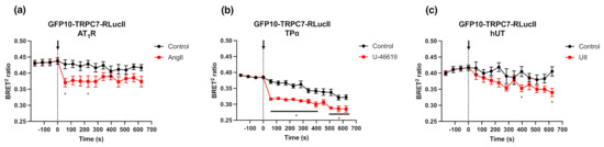 We next investigated the activation of GFP10-TRPC7-RLucII biosensor (75 ng) in response to different Gαq-coupled receptors (500 ng), namely the Angiotensin II type-1 receptor (AT1R), thromboxane A2 receptor alpha (TPα), and Urotensin II receptor (UT). The stimulation of these co-transfected receptors with saturating concentrations (1 µM) of Angiotensin II (AngII), U-46619 (a synthetic TPα agonist), and Urotensin II (UII), respectively, induced a decrease in BRET ratio (Figure 4a–c). Interestingly, the amplitude and kinetic of activation of the GFP10-TRPC7-RLucII biosensor under these conditions differed amongst the three tested Gαq-coupled receptors, suggesting divergent pharmacokinetic properties and/or relative propensity to activate Gαq protein by their respective agonists.