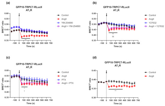 Since GFP10-TRPC7-RLucII displayed a superior dynamic range upon AT1R agonist stimulation (0.057 ± 0.019), which has already been demonstrated to play a role in TRPC7 activation [14], and as compared to TPα (0.055 ± 0.007) and UT (0.022 ± 0.024), we further characterized this biosensor using AT1R, which is known to couple to Gαq, Gαi/o and Gα12/13 [29,30,31]. Therefore, we investigated the effect of pharmacological inhibition of specific AT1R pathways by using the Gαq/11 inhibitor YM-254890 (1 µM), the Gαi/o inhibitor pertussis toxin (PTX) (100 ng/mL), and the Rho kinase inhibitor Y27632 (10 µM), a downstream effector of the Gα12/13 pathway (Figure 5a–c). The activation of GFP10-TRPC7-RLucII was completely suppressed with YM-254890 (Figure 5a). In contrast, PTX and Y27632 did not impact the BRET signal of GFP10-TRPC7-RLucII activation (Figure 5b,c). Other members of the TRPC family, namely TRPC3 and TRPC5, have been demonstrated to be activated downstream of Gαq/11 and Gαi/o [32,33,34]. Under our experimental conditions, the results demonstrate a predominant role of the Gαq/11 pathway in the activation of TRPC7 following AT1R stimulation.