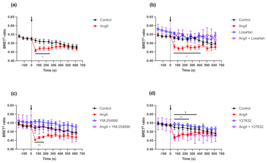 Stimulation of endogenous AT1R induces GFP10-TRPC7-RLucII biosensor conformational changes. Isolated rat neonatal cardiac fibroblasts were infected with the adenovirus encoding GFP10-TRPC7-RlucII biosensor. (a) Cells were stimulated with AngII (1 µM) 48 h post-infection, and BRET signal was measured for 10 min. Cells were pre-incubated with Losartan (100 µM) (b), YM-254890 (1 µM) (c) or Y27632 (10 µM) (d) before BRET measurement, and stimulation with AngII (1 µM) or vehicle as a control. BRET signal was measured for approximatively 10 min. Each data set represents the mean of three independent experiments, which were each performed in triplicate, and expressed as the mean ± S.E.M. Statistical analyses were performed using a two-way ANOVA with multiple comparisons, followed by a Sidak’s post-hoc test. * p < 0.05, ** p < 0.01 for control vs. AngII and $ p < 0.05 for Y27632 vs. AngII + Y27632.